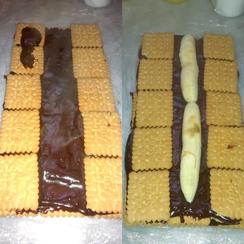 Kenarları 3, ortası 2 olacak şekilde dizip, krema sürüyoruz. Muzları ikili olan orta sıraya uzunlamasına koyuyoruz. Folyonun her iki tarafını tutup, dikkatlice kaldırıyoruz ve muzların üzerinde üçgen olacak şekilde birleştiriyoruz. Buzdolabında bir gece veya en az üç saat dinlendiriyoruz. Ayırdığımız kakaolu karışımı da buzdolabına kaldırıyoruz.