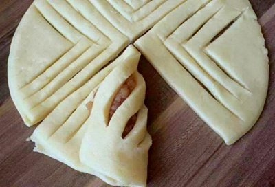 Küçük bezelere ayırıyoruz. Ayırdığımız mezeleri bir merdane ile açıyoruz ve 4 eşit parçaya bölüyoruz. Her parçanın kenarlarından başlayıp, iç içe V şeklinde kesiyoruz. İçin harcımızdan koyuyoruz. Üçgen kenarları birbirinin üzerine kapatıyoruz.
